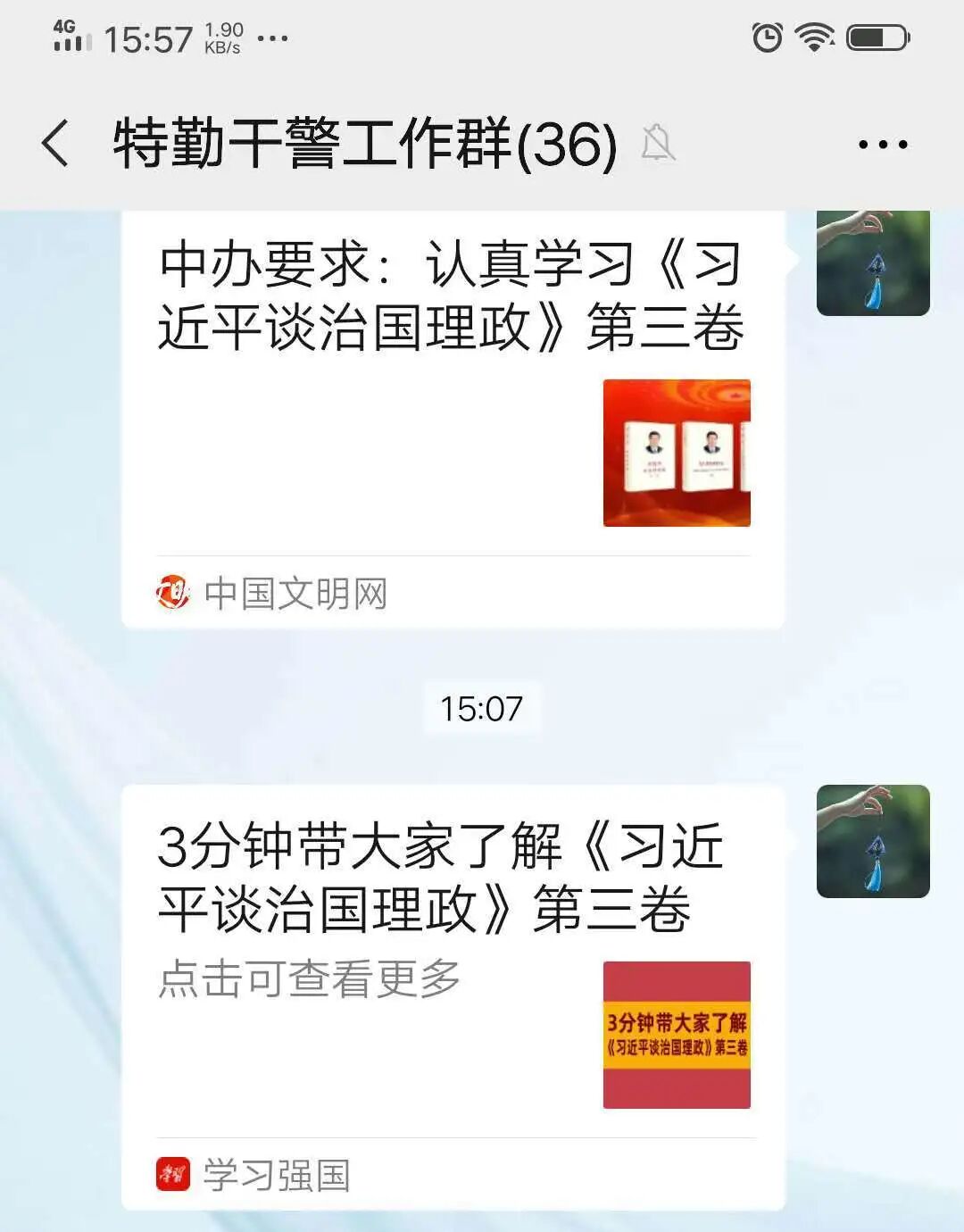 大力推行在微信工作群广泛开展“核心要点每周一学”活动,定期推送相关导读文章和内容,并落实线上学习打卡考勤,有力督促民警职工抓好学习落实。
